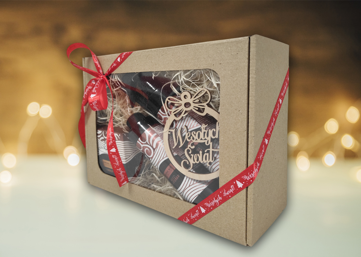 Zestaw zapakowany jest w ozdobne pudełko z wypełnieniem, które zachwyca wyglądem i roztacza magiczny świąteczny zapach już od pierwszej chwili.